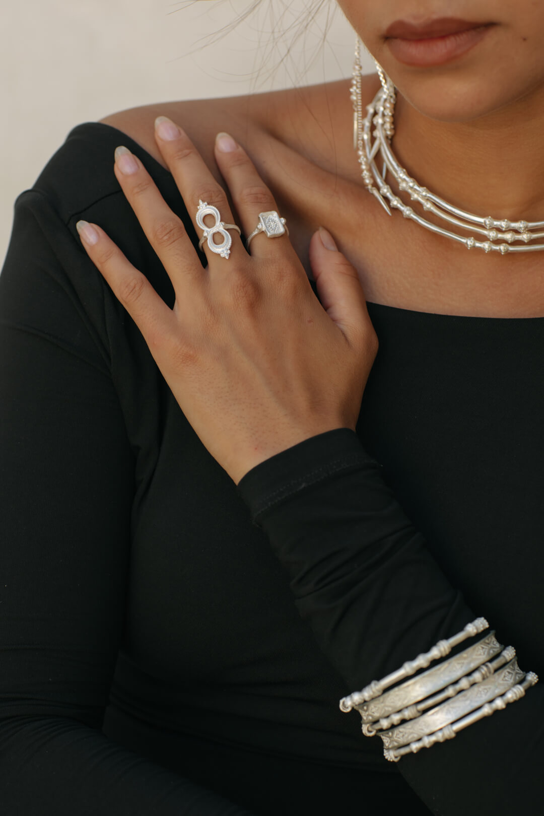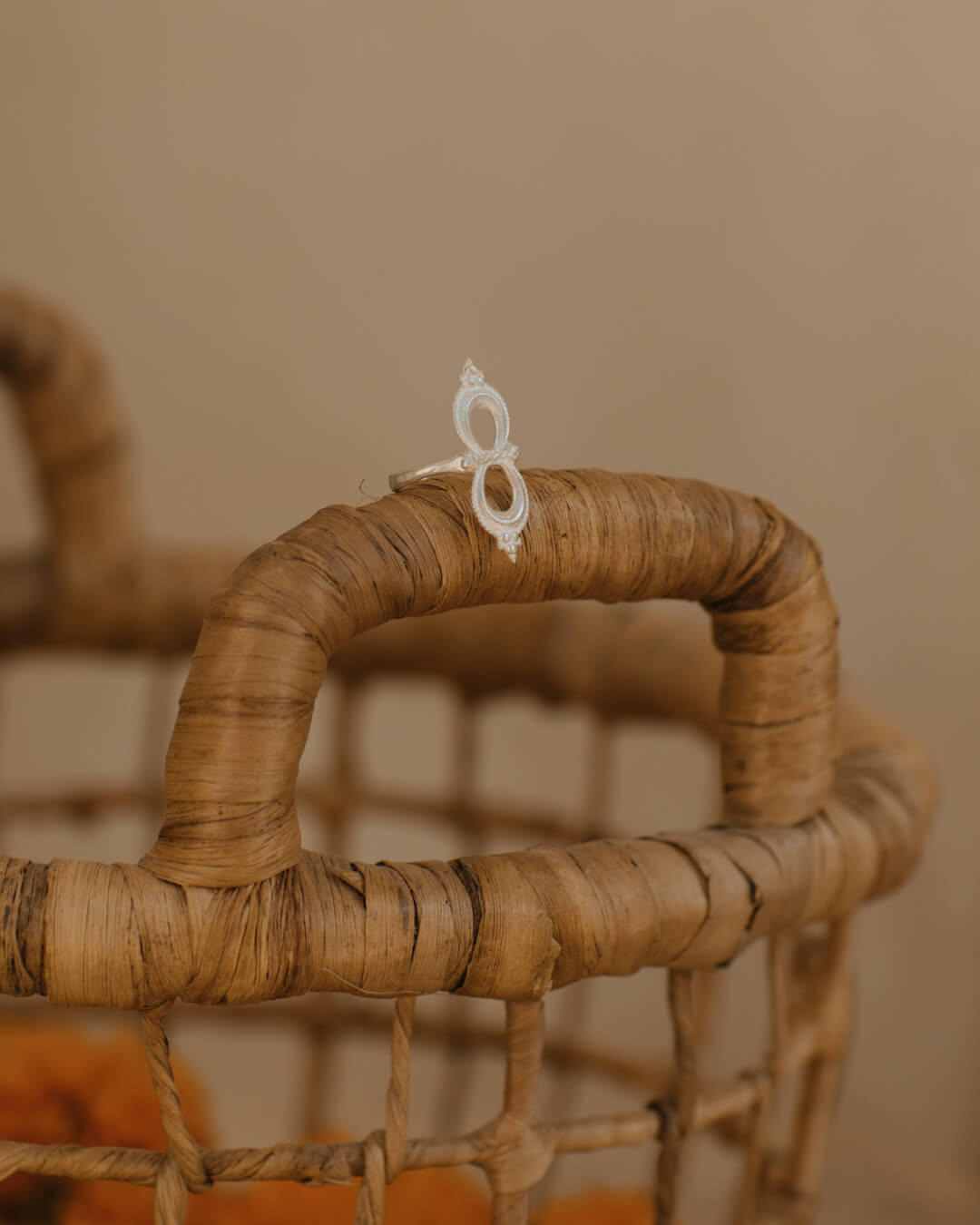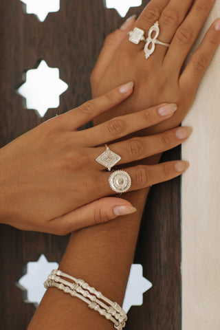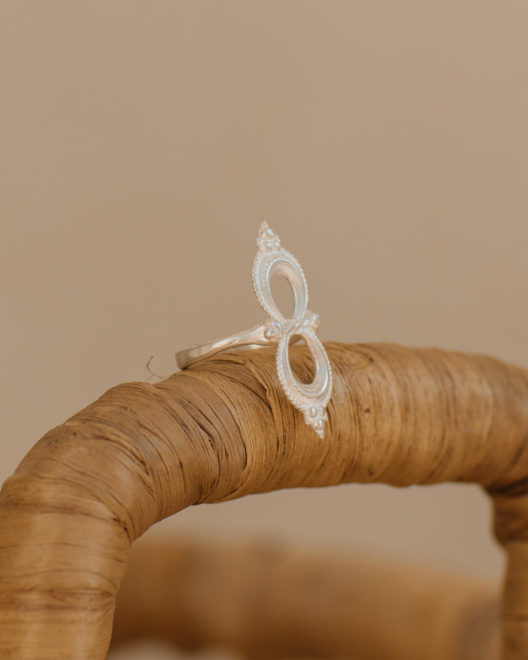 The Nailah ring is visual poetry , a statement piece that brings effortless elegance . This stunning ring features intricate detailing inspired by tribal jewellery from Karnaka , India . Handcrafted in 925 sterling silver .