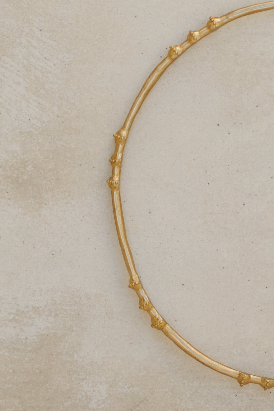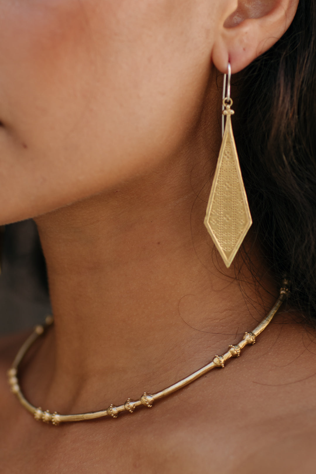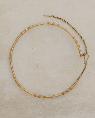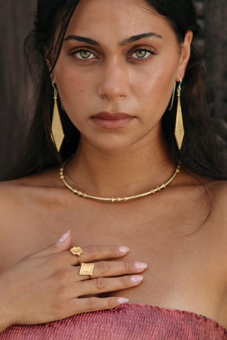 Slightly rugged textured choker necklace with ancient aesthetic motifs , this stunning handcrafted adornment is the perfect elegance to any outfit . Whether worn alone or layered with other pieces, the Kavani choker is sure to make a statement.