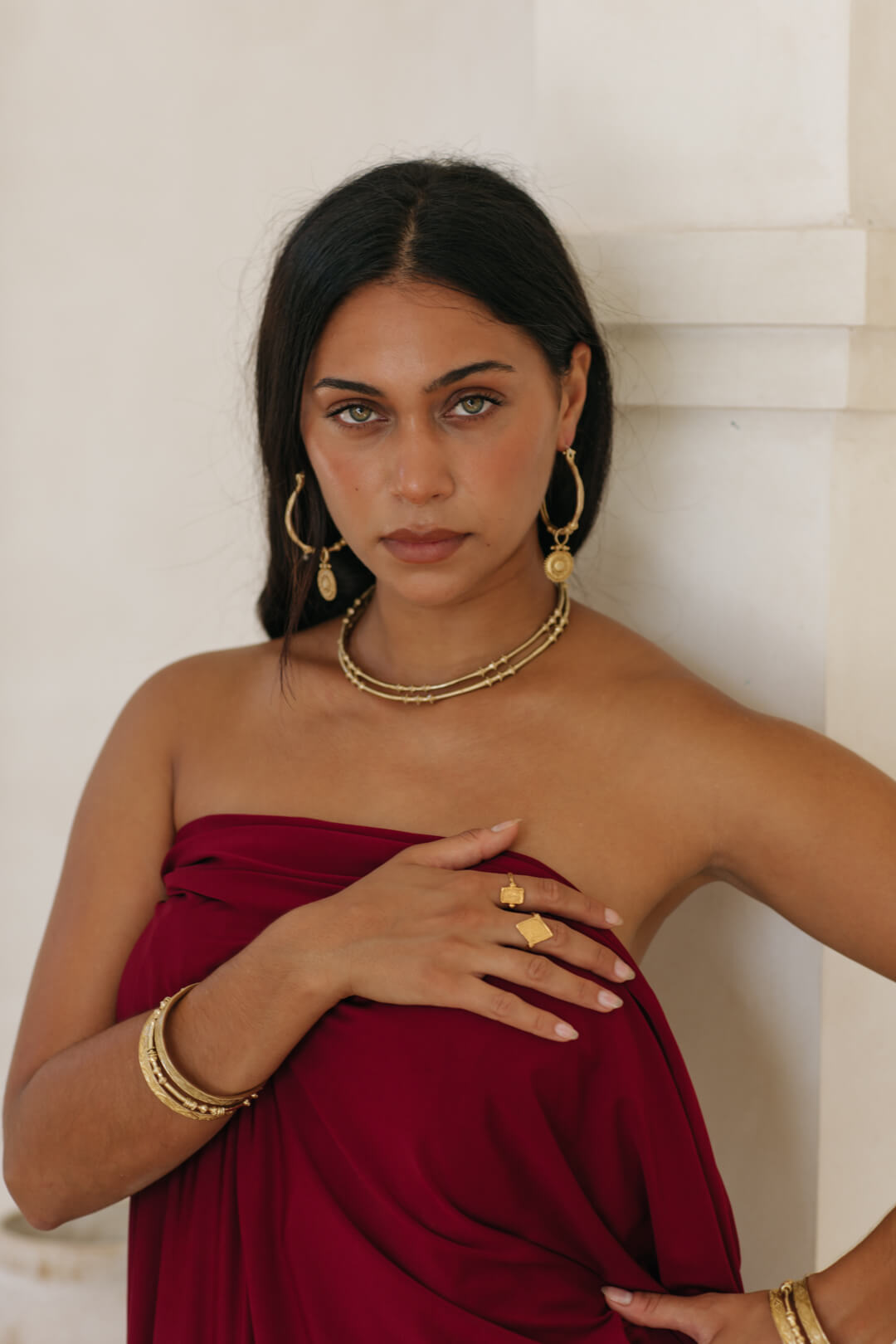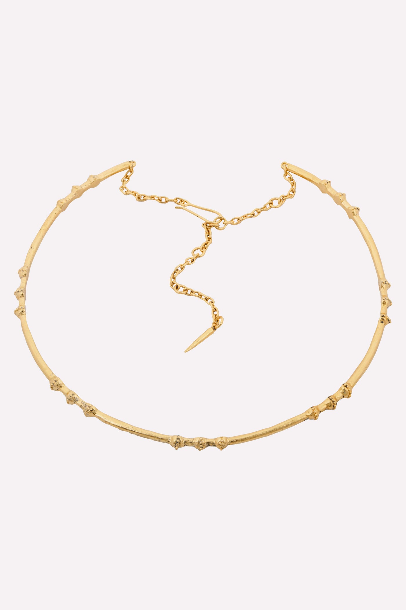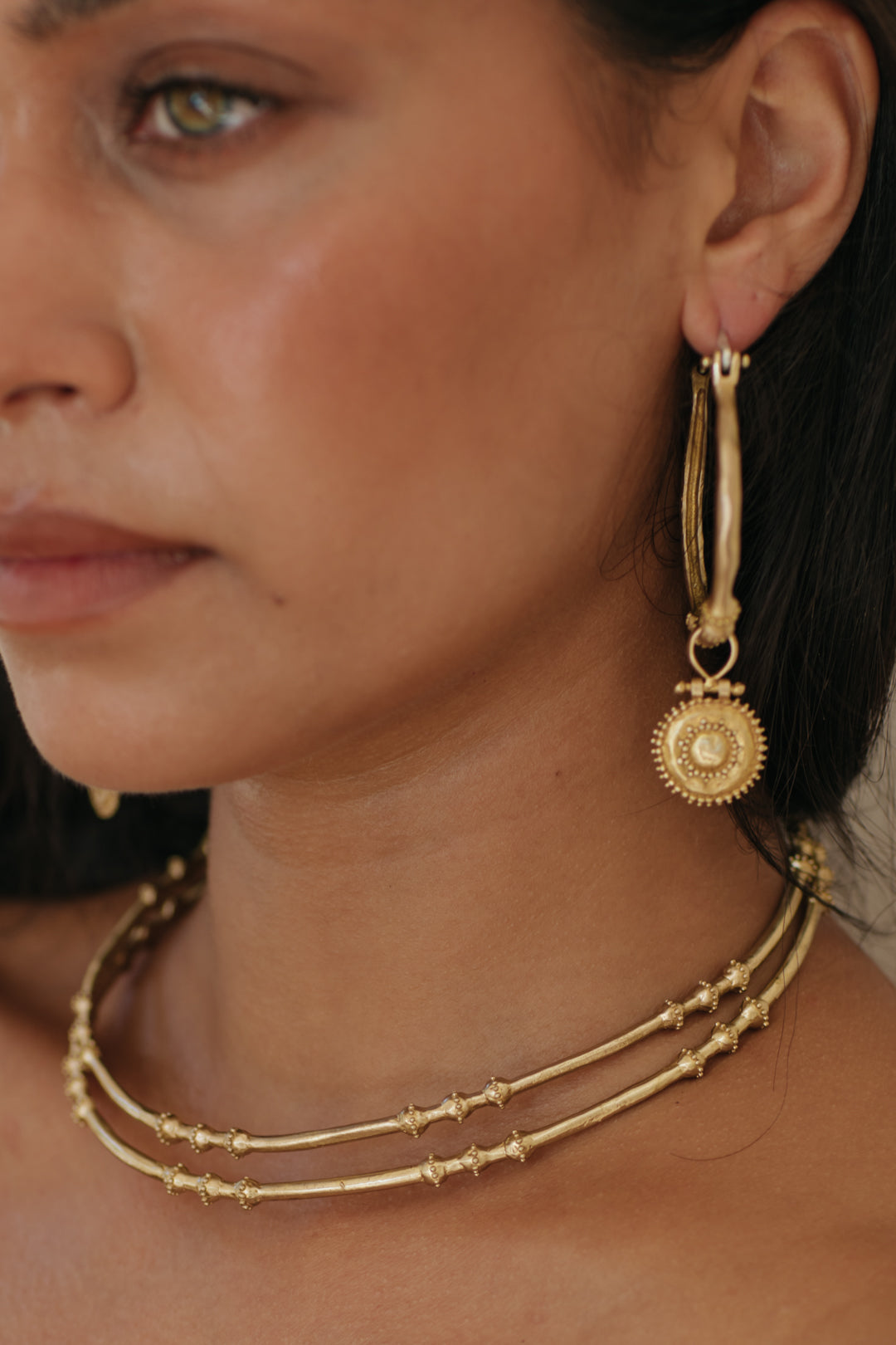 Slightly rugged textured choker necklace with ancient aesthetic motifs , this stunning handcrafted adornment is the perfect elegance to any outfit . Whether worn alone or layered with other pieces, the Kavani choker is sure to make a statement.