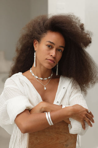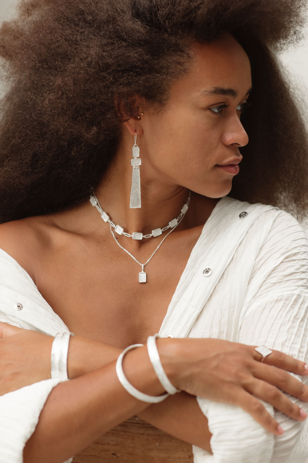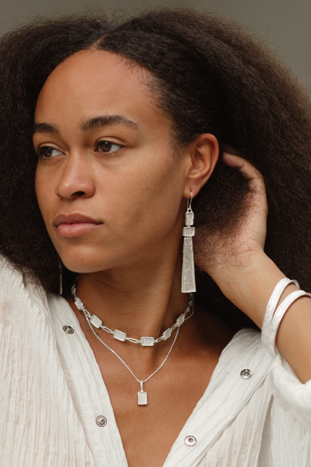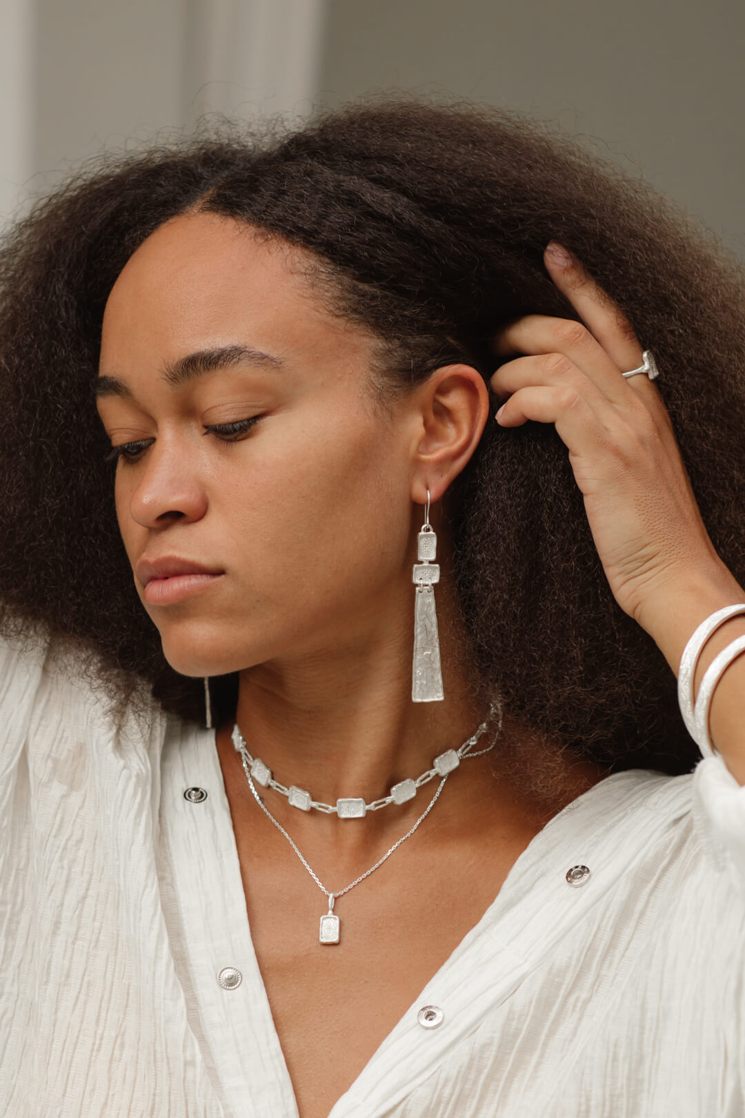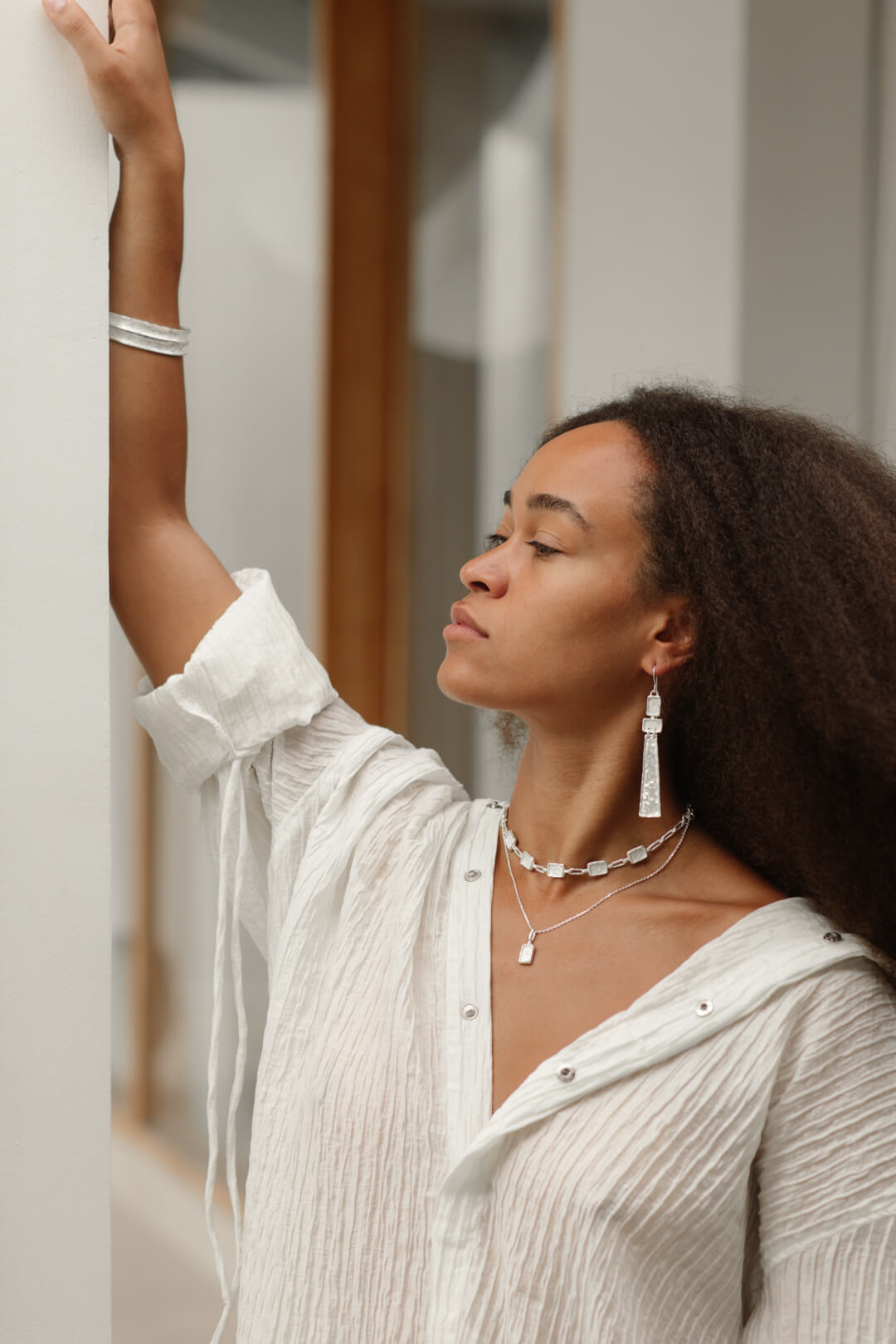 The Ayana Earrings exude strength and femininity. Handcrafted from high quality white brass layered with silver plating in a matte finish , these statement earrings are uniqueness draped in elegance .