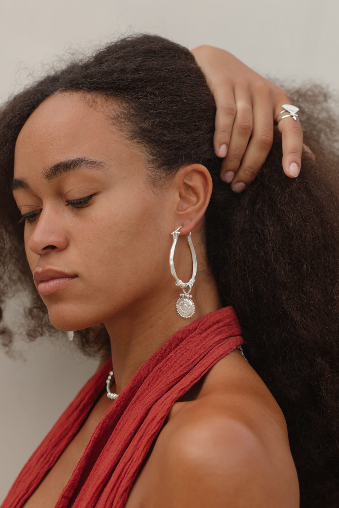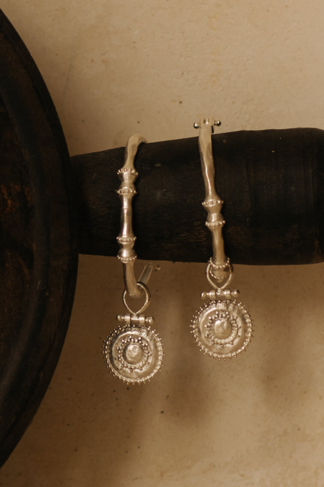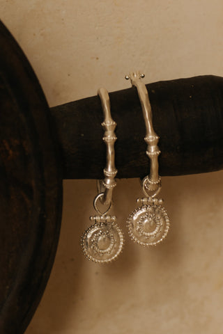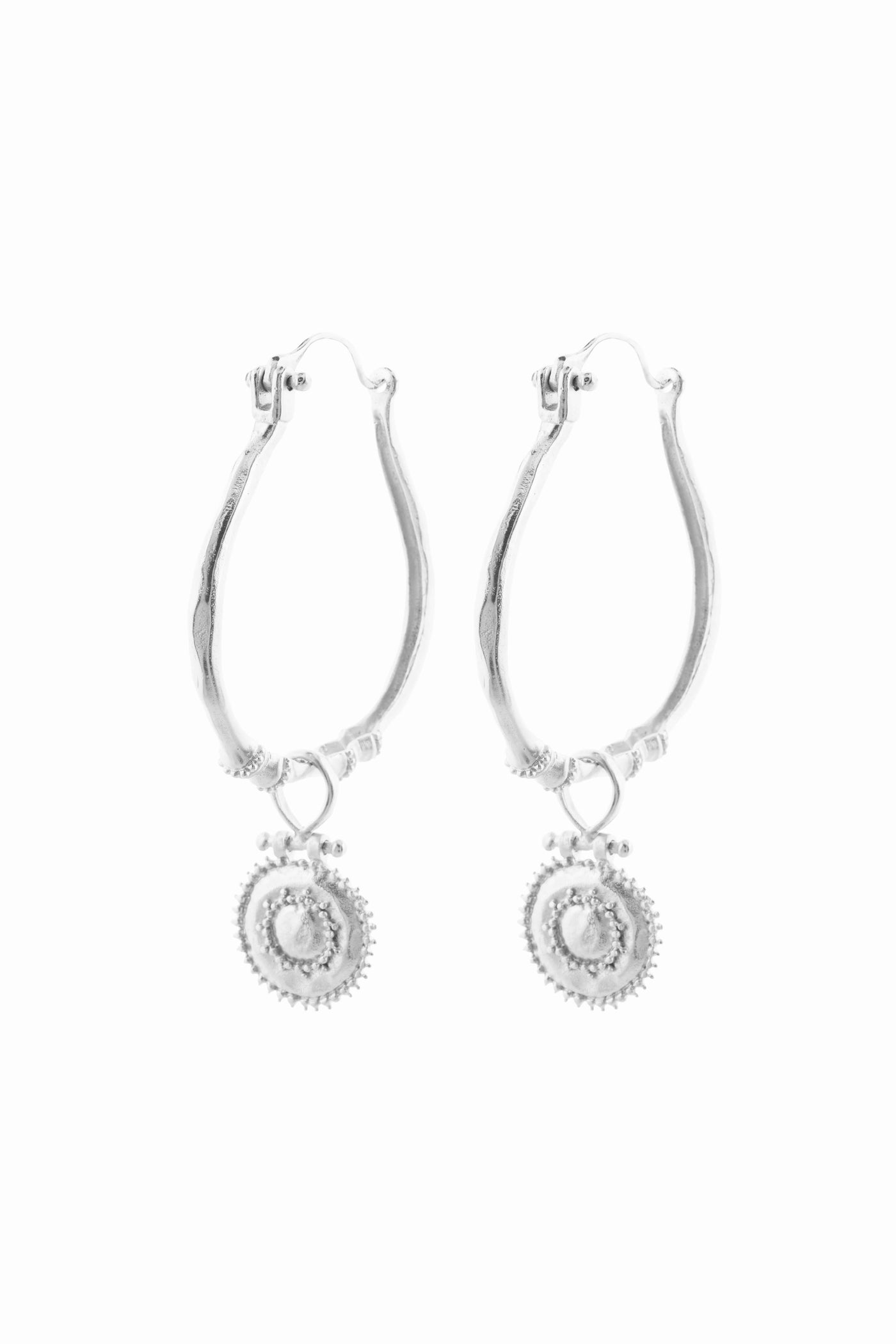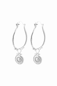 Organically shaped hoops with an ancient aesthetic , these beautiful statement adornments are just as elegant as they are timeless . The Unique trinket is inspired by early Byzantine craftsmanship . Made from high Quality white brass , solid sterling silver ear hook , layered with a lush 2 microns of silver plating with a matte finish to give it that antique look .