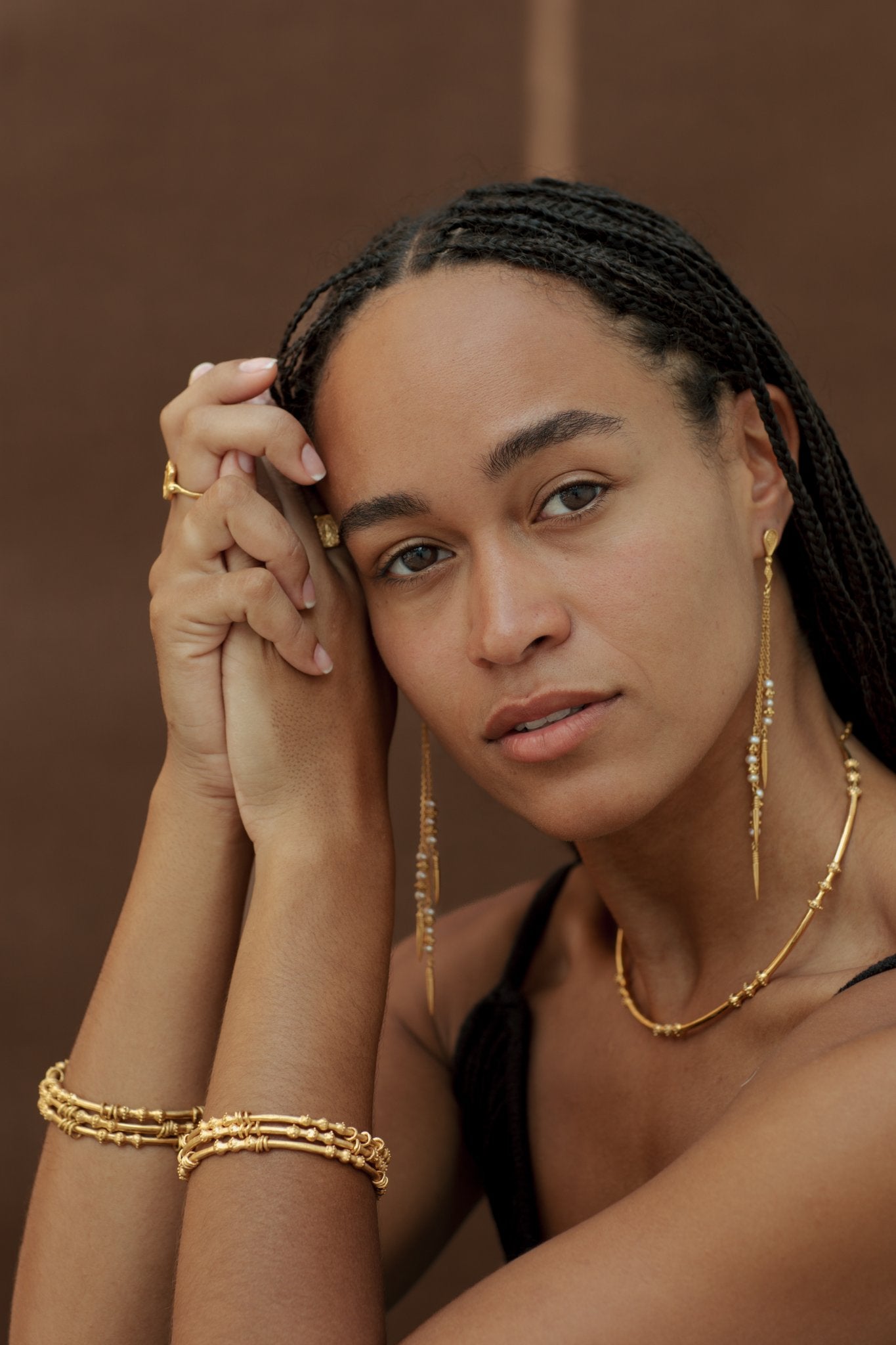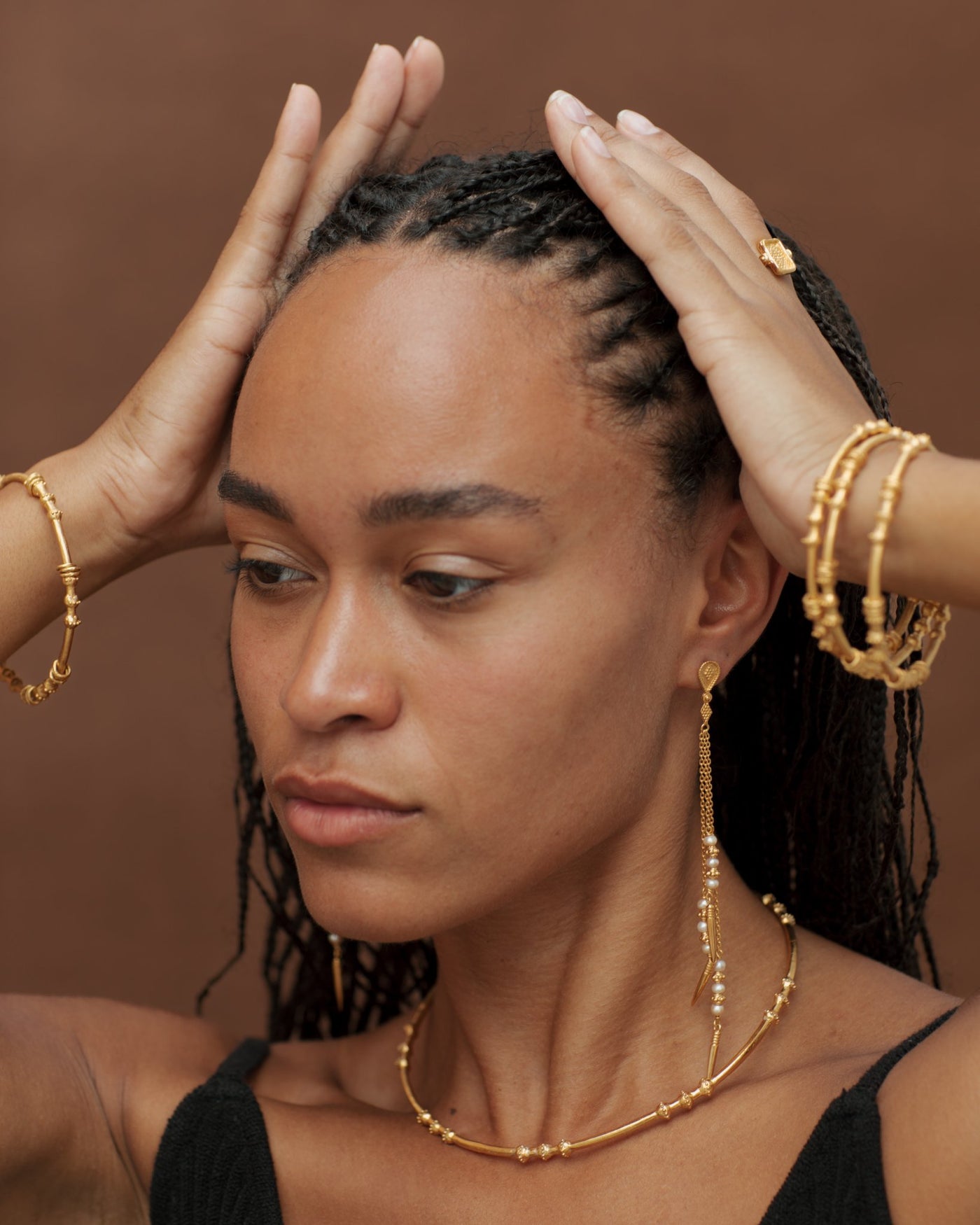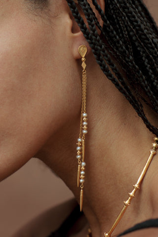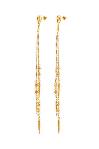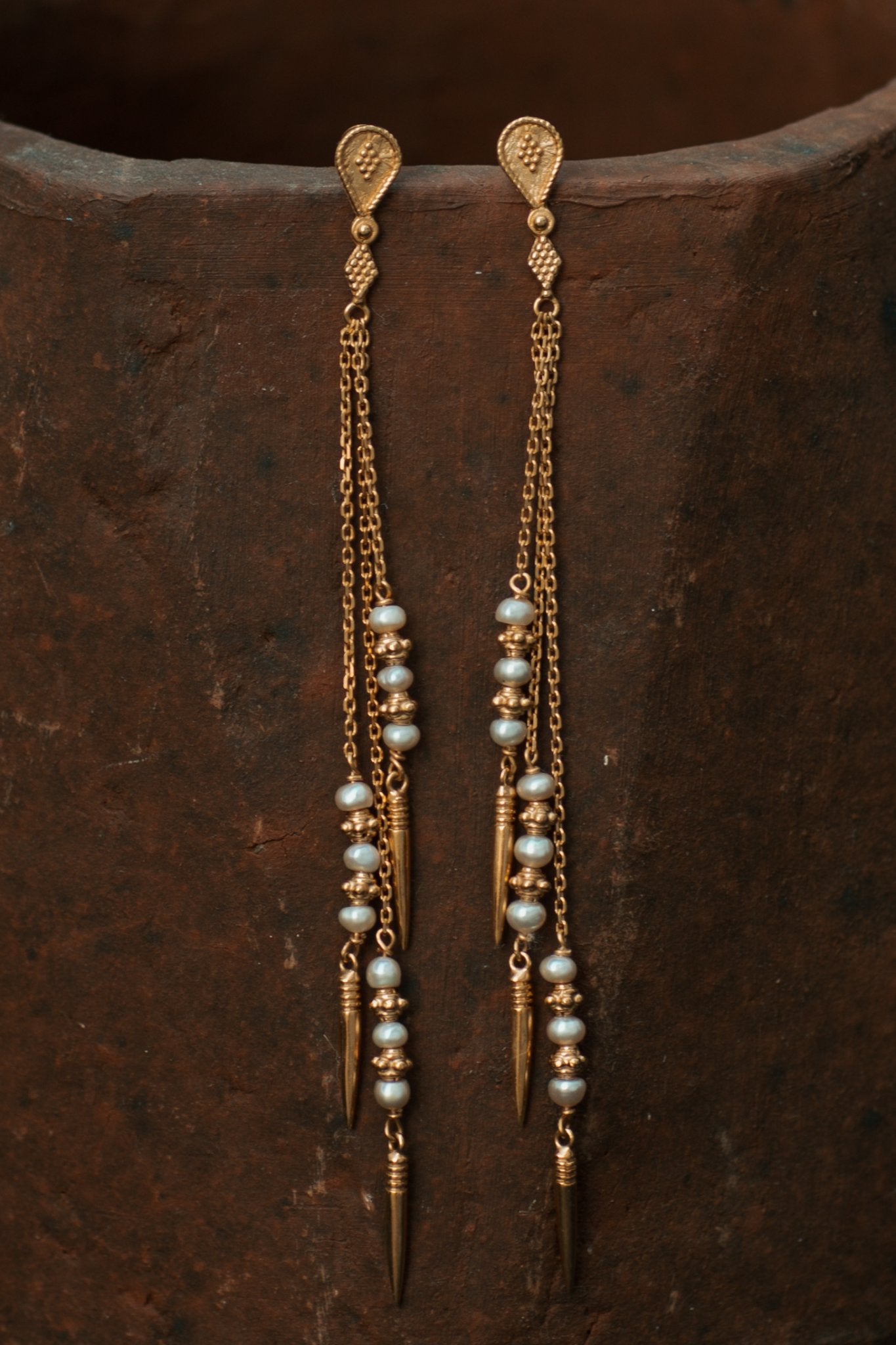 Each pair is handcrafted in sterling silver layered with a lush 2 microns of 22k gold plating and adorned with pearl embellishments .