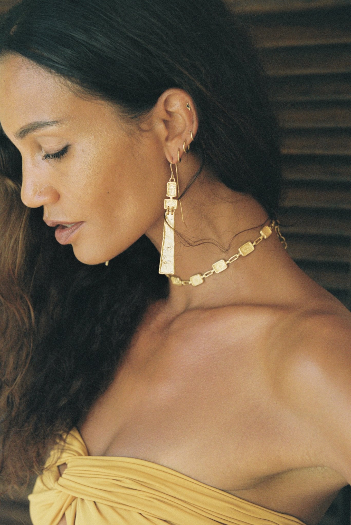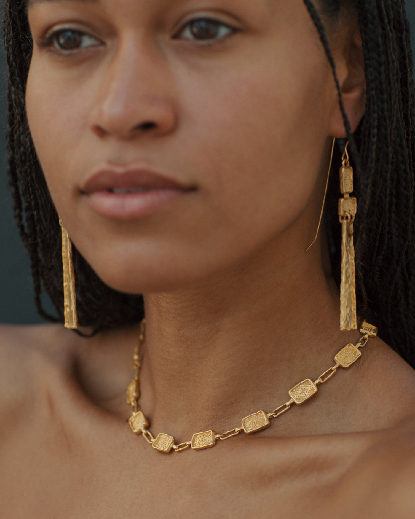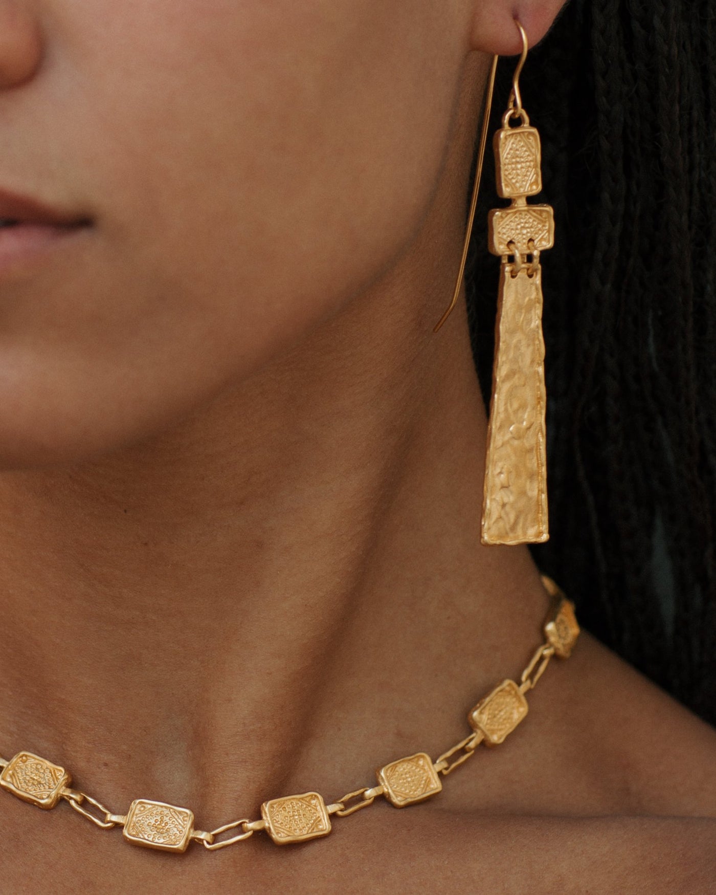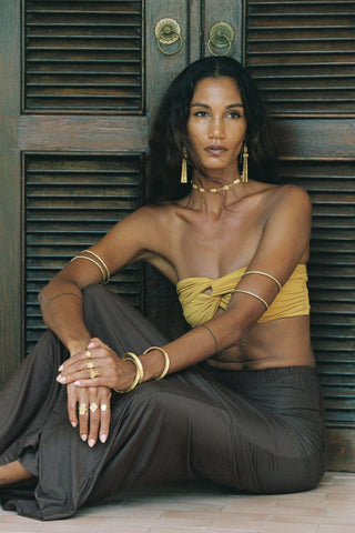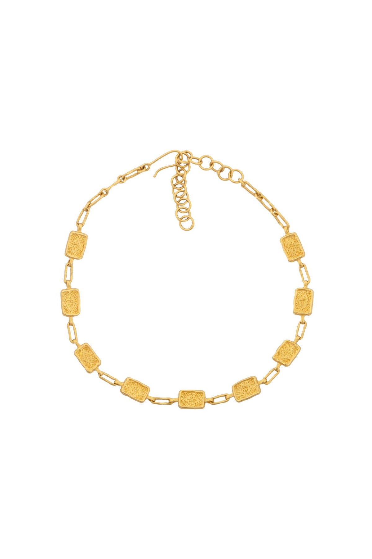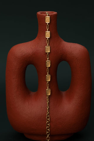 The Najma choker is a stunning handcrafted piece of jewellery made with high-quality Italian brass, plated with a lush 2 microns of 22k gold in a matte finish .This statement adornment is inspired by the opulent jewellery of the Byzantine era . The Najma choker is timeless elegance to last a life time .