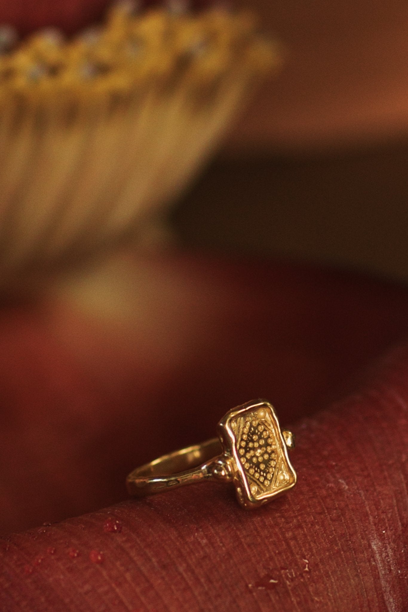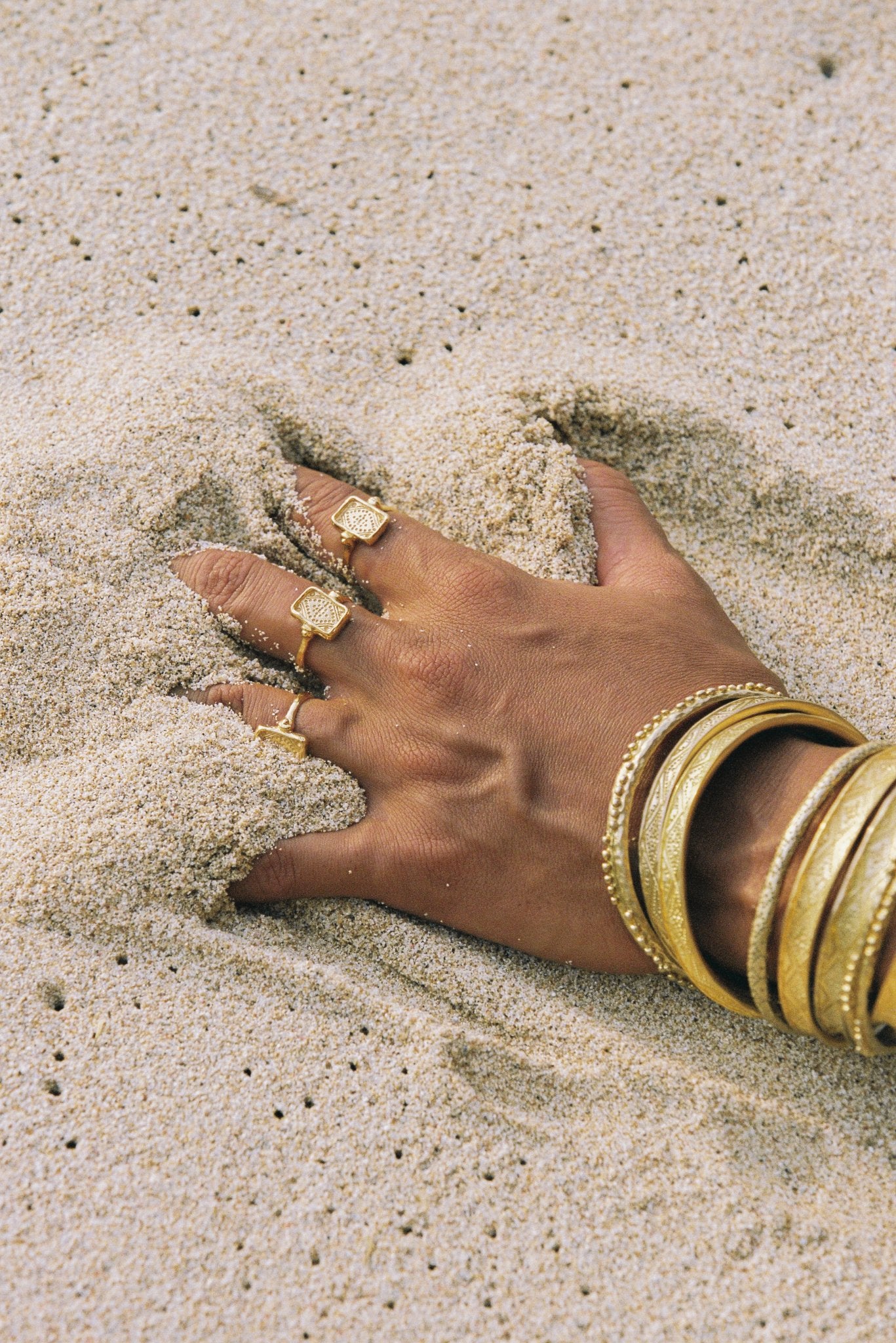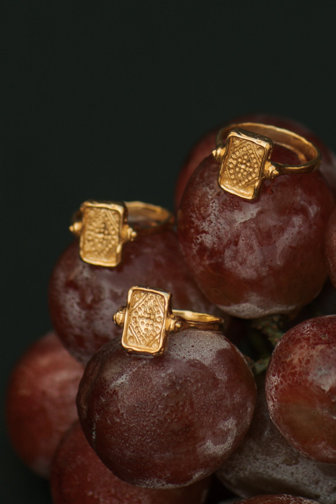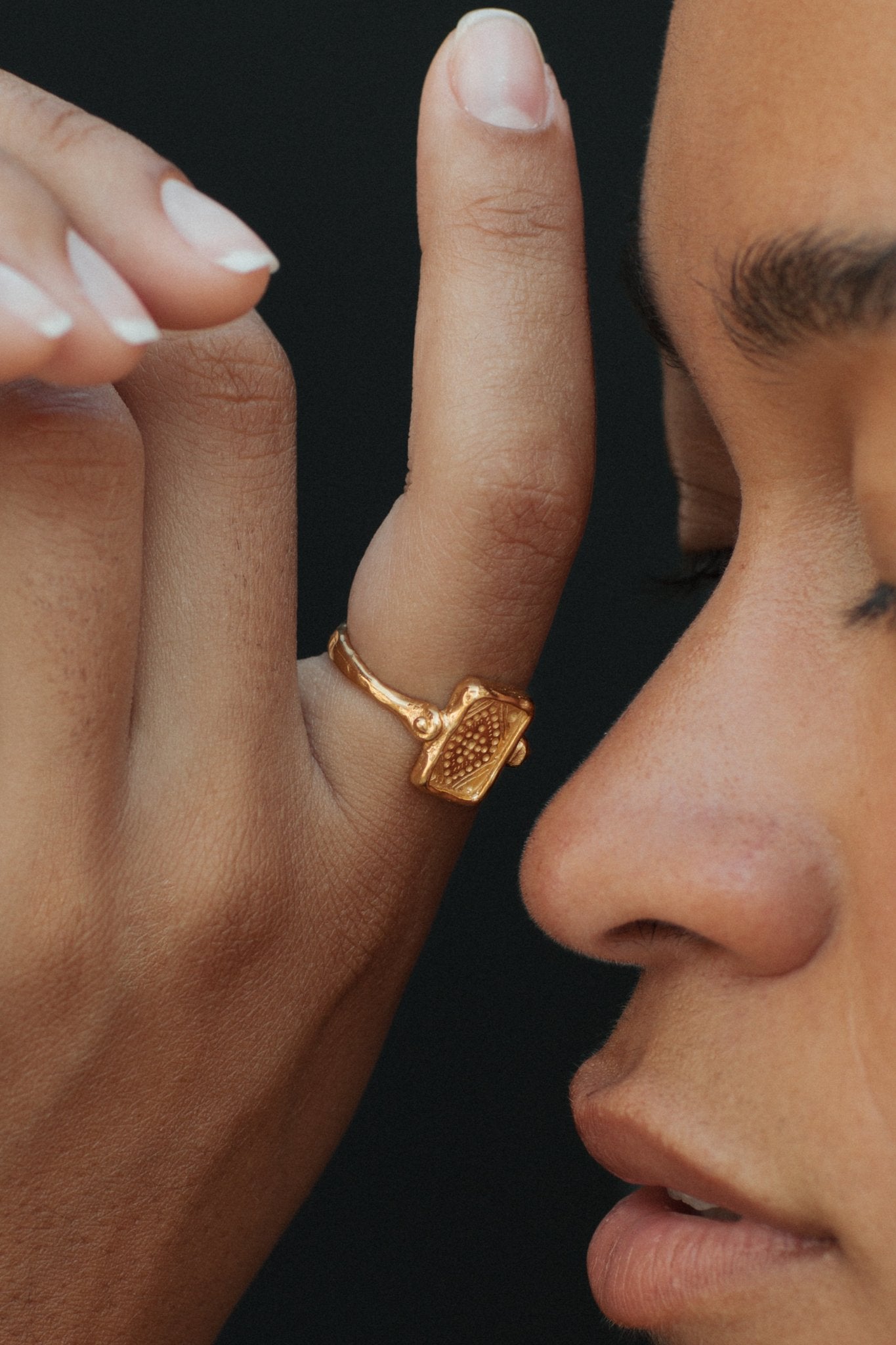 Crafted by the hands of highly skilled artisans and Inspired by the opulent jewellery of the Byzantine era, the Najma Ring is a timeless adornment . Made from 925 sterling silver with a lush 2 microns of 22k gold plating with a matte finish .