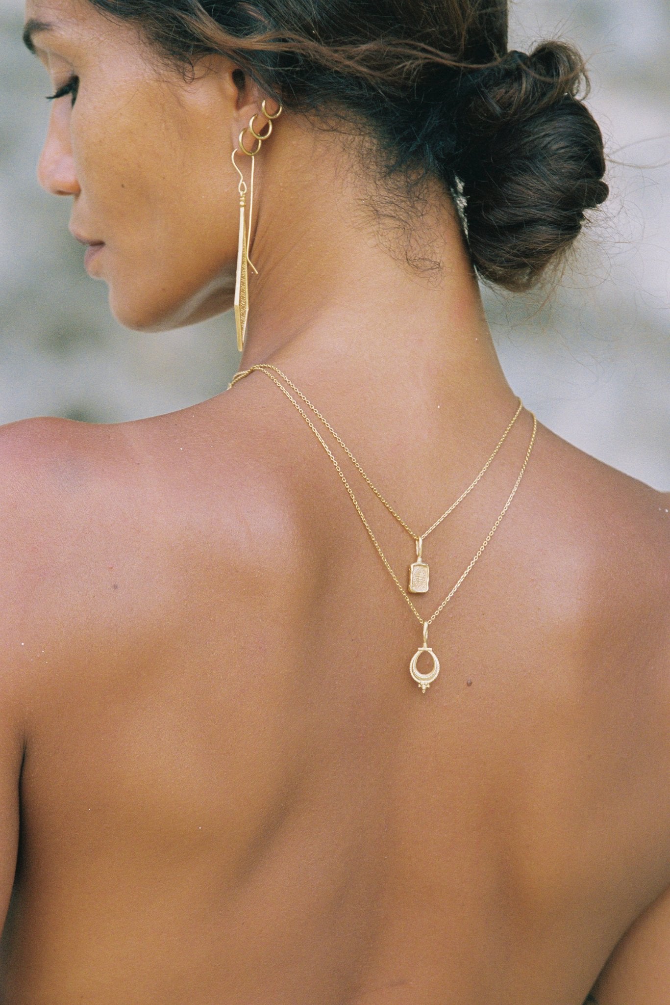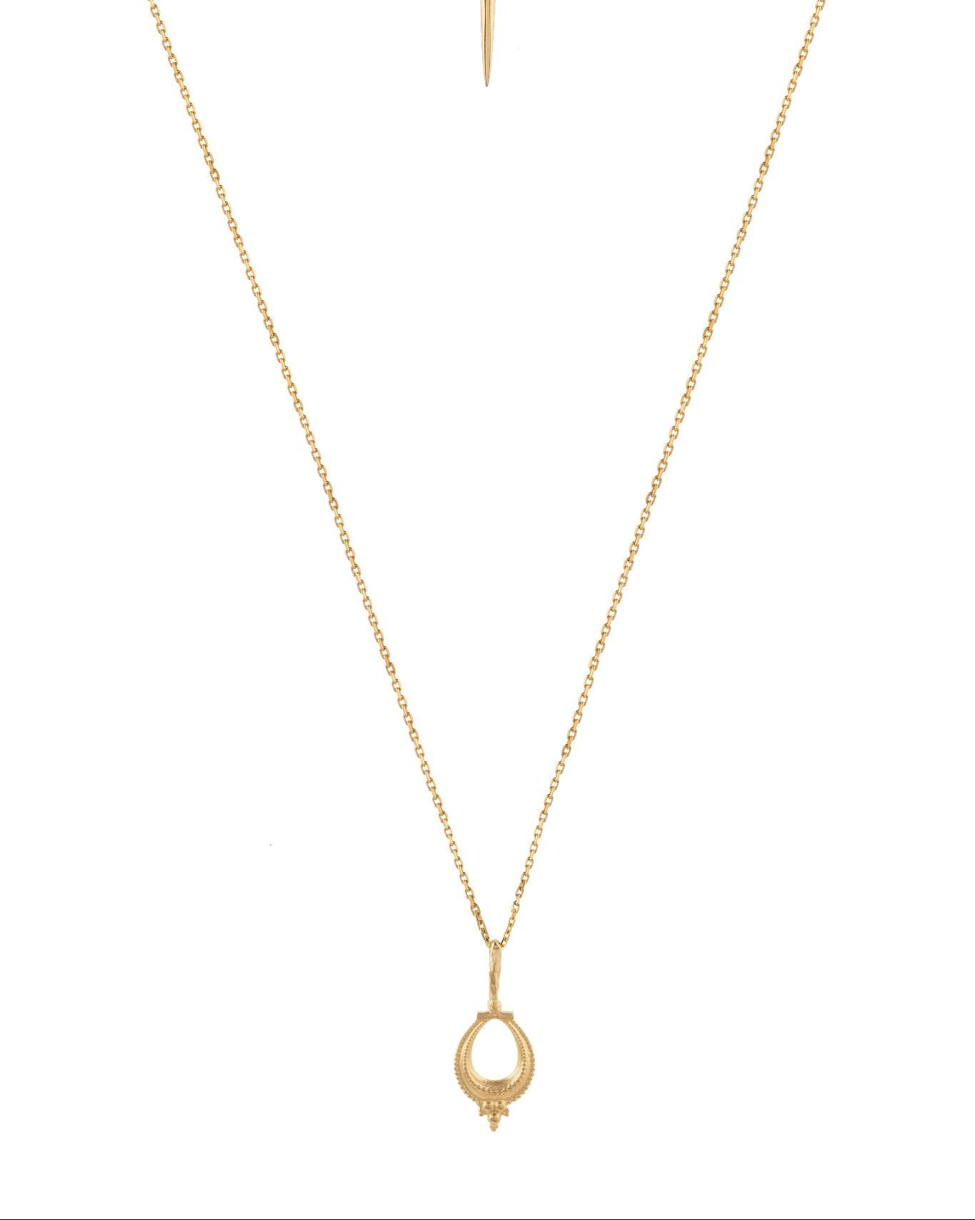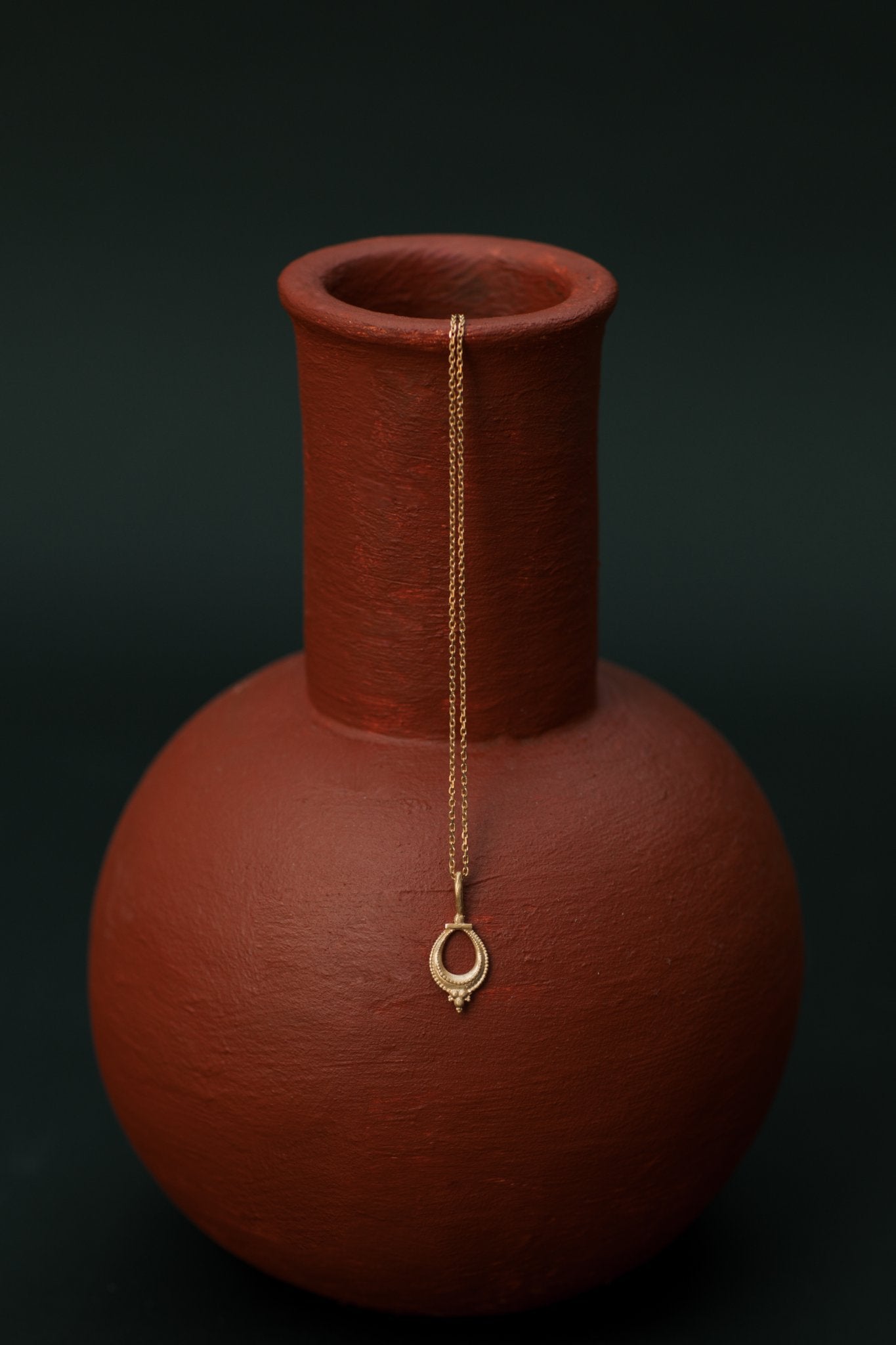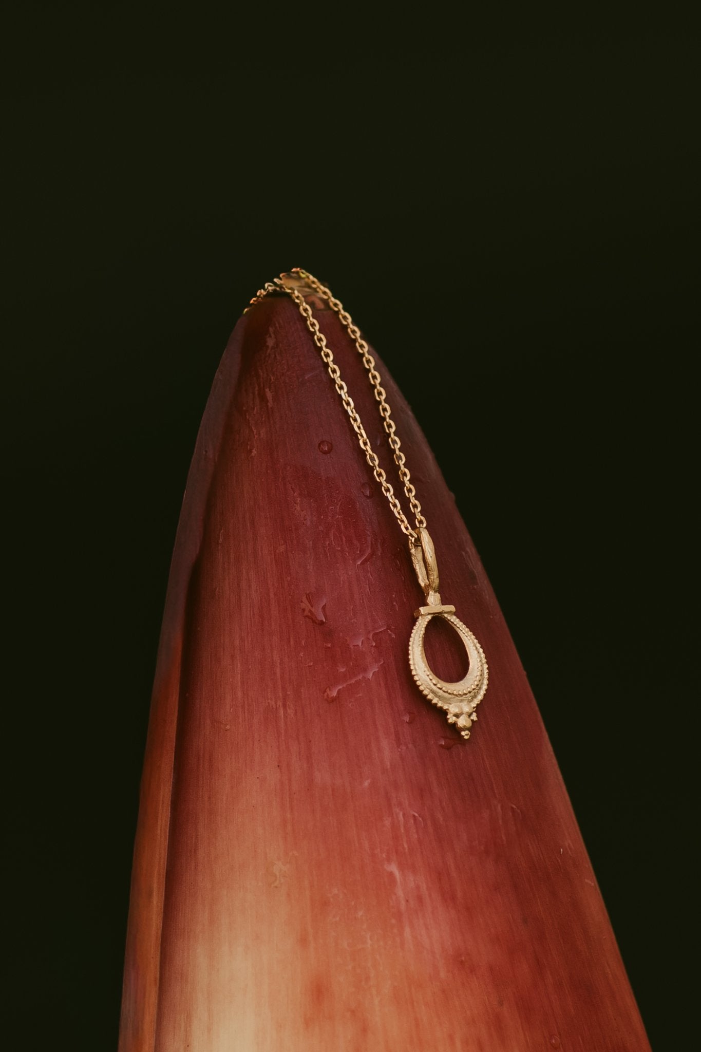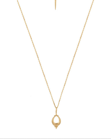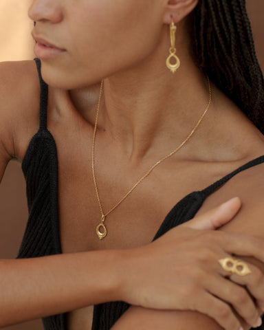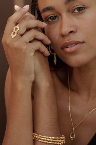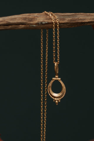Nalini is a Sanskrit name that primarily means "lotus ' or "lily", and is also described as "sweet lotus " or "sweet nectar ". In Hindu culture, the lotus symbolizes purity, beauty, prosperity. This beautiful pendant features an intricate detailing motif inspired by tribal jewellery from Karnataka , India . The Nalini necklace is a timeless adornment that can be worn solo or layered with your favourite pieces .
